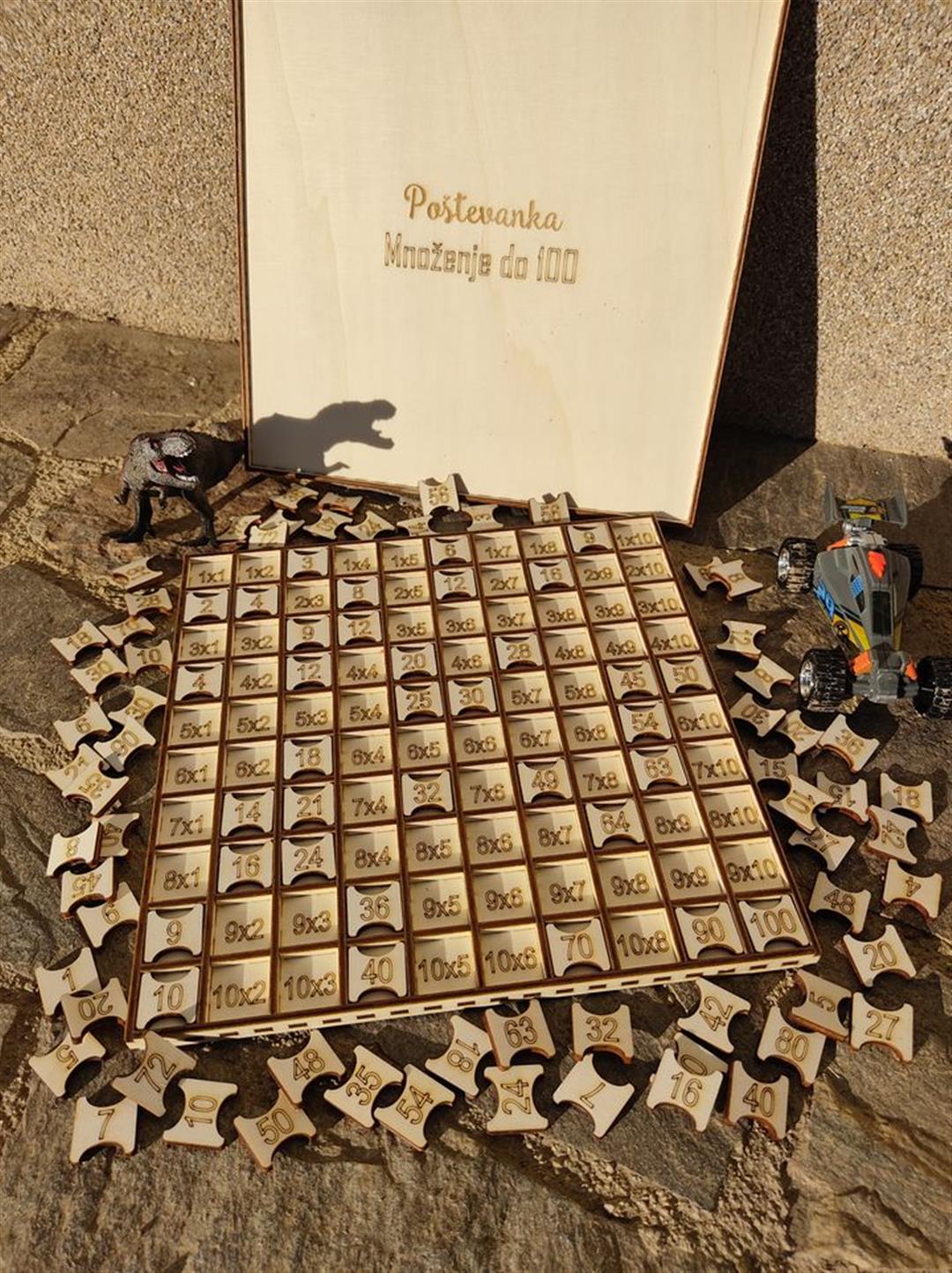 Na osnovni plošči so zapisani računi s poštevanko števila 1 do 10. Zraven so priložene gravirane lesene ploščice s pripadajočimi rezultati. Ploščice polagate na tabelo tako, da pokrijete ustrezen račun množenja s pripadajočim rezultatom. Setu osnovne plošče in tablic z rezultati pripada tudi pokrov oz. se naredi škatla.